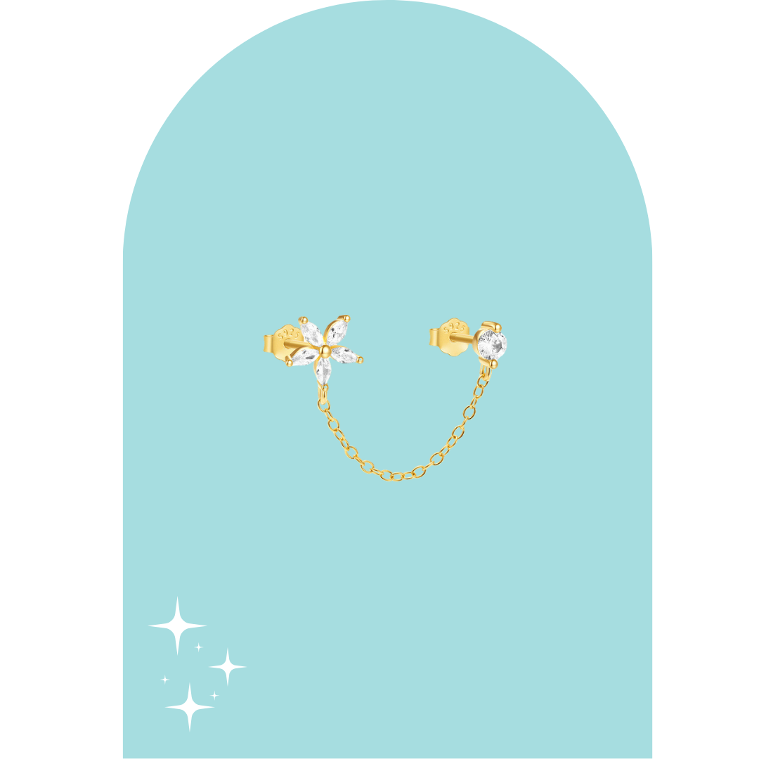 Aretes dorados decorados con una flor de cristales y un stud brillante unidos por una delicada cadena. Elegantes y modernos, ideales para un estilo sofisticado con un toque original.